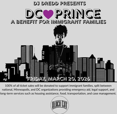 100% of all ticket sales will be donated to support immigrant families, split between national, and community organizations in Minneapolis and Washington, DC, that provide emergency support to immigrant communities—including help with housing, food, transportation, legal defense, and community‑based healing, and verified mutual‑aid funds supporting families of victims of ICE violence in Minneapolis. The goal is simple: dance together, grieve together, and move resources to people who are living with the fallout of enforcement in both Prince’s city and our own.